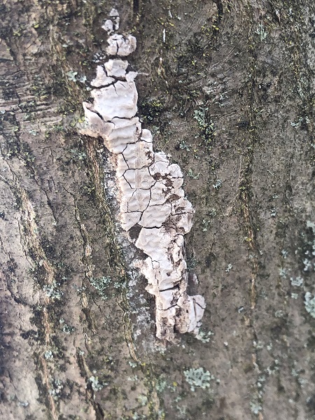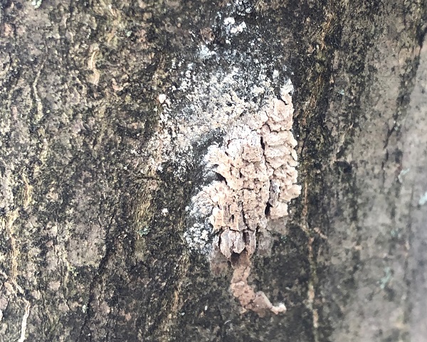 To find the lanternfly egg masses, look for a light-ish colored spot on the tree – it might initially resemble a lichen, but on closer inspection it will look like a smear of dirt on the tree. When freshly laid, the egg masses are a darker brown, but in spring/summer they will be light brown and may be starting to crack. You might be able to see little rows of eggs peaking out from under the protective dirt layer. Often these can be found on the underside of tree branches and under parts of the tree where branches split, where they are sheltered from the rain and elements. Egg masses can be found on any surface, including the exterior of houses and even cars, so be alert for these in other areas around your property. Both of these pictures are of egg masses on my Japanese maple trees, which seem less susceptible to lanternfly damage, but that may be because they prefer the red maple in my yard.