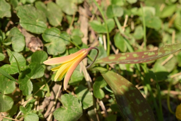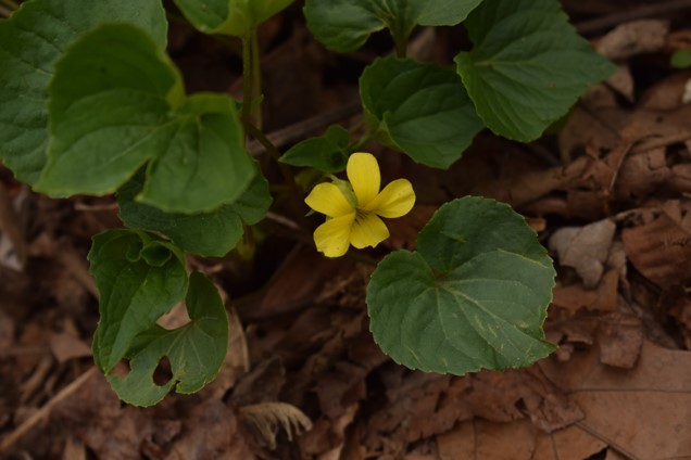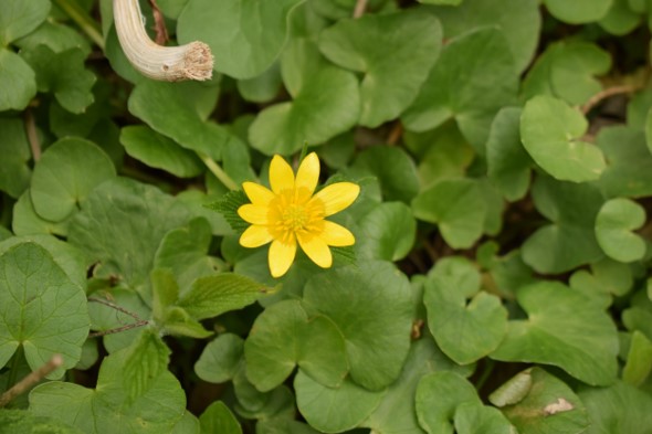 Unfortunately some of the striking wildflowers are not native to this area and are actually very invasive.  That is the case for this seemingly-innocent yellow flower on the left, Lesser Celandine.  Lesser Celandine colonizes disturbed areas along streams and road ways – if you see a thick blanket of green and yellow, you’re most likely looking at it.  Lesser celandine comes up early and grows from prolific tubers underground, swallowing up native plants.  It dies back in early June, leaving the ground ripe for runoff.  The beautiful native Trout Lilly is unable to grow through the dense mats of invasive celandine and in many areas is lost from the native ecosystem.
