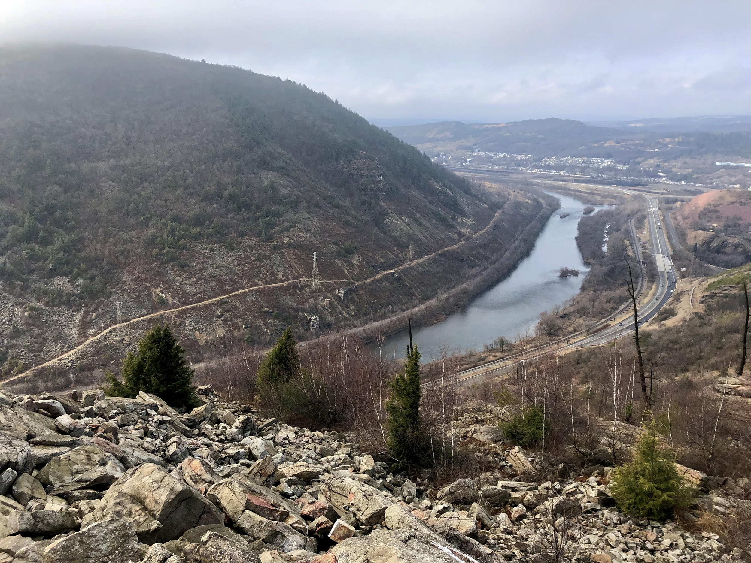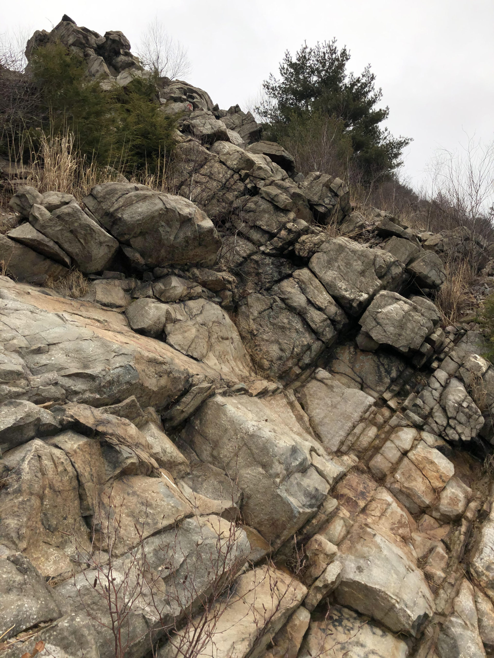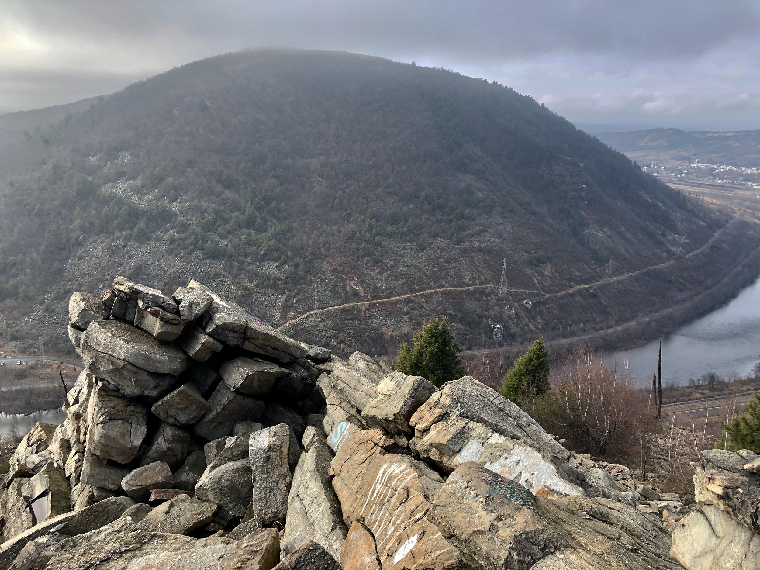Pretty quickly the trail opened to a scree field with a view of the river below and we had ascended far enough that the car noise faded to a low hum. Again, I was struck by the juxtaposition of nature along the AT with the evidence of civilization – you can see the highway crossing the river, an airport in the distance, and swaths of trees cleared for industrial purposes. The cloud cover remained over the area, but at least we started to get a great view! A woman hiking with her mom (who I guess was in her 50s-60s, good for her doing this hike!) warned us of the climb ahead being rough for dogs and I brushed it off. If Hank the adventure dog could conquer an icy Mount Marcy in the Adirondacks, no dinky little PA hill was going to affect him! Lehigh river from Appalachian Trail After this view point the trail began to climb more steeply to the point where it became like a little slabby bouldering route. I love to rock climb, so getting to use my hands to ascend a hiking trail is always rewarding. The stone was slick from previous rain and while the humans had no trouble, our furry companion did do a little slipping and sliding trying to ascend the rock face, forcing me to eat my words. With some teamwork, we were able to guide him and lift him up the rocks. I wish I had thought to take a picture before starting the climb because the rock was smoother and steeper than I had anticipated. Next time, I will remember to bring my dog’s harness so we can have an easier time if we have to hoist him up a slippery section.